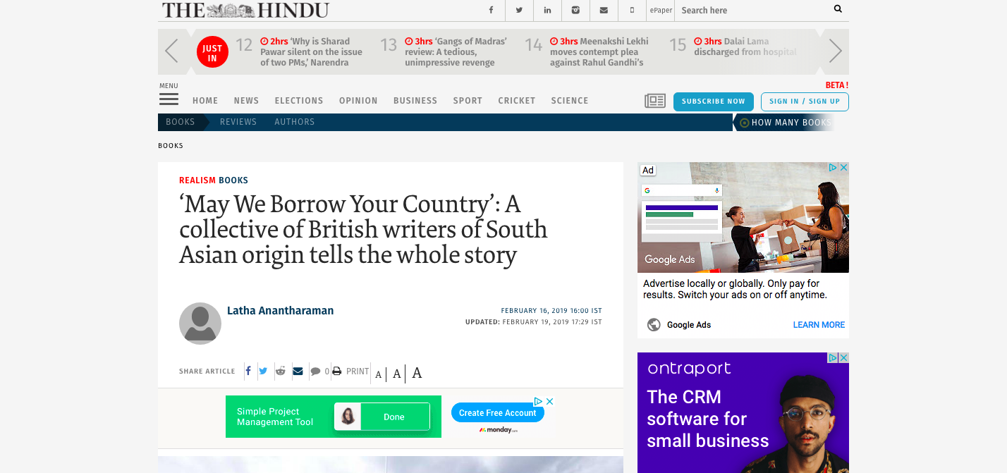 May We Borrow Your Country reviewed by Mint Lounge and Hindu in India.